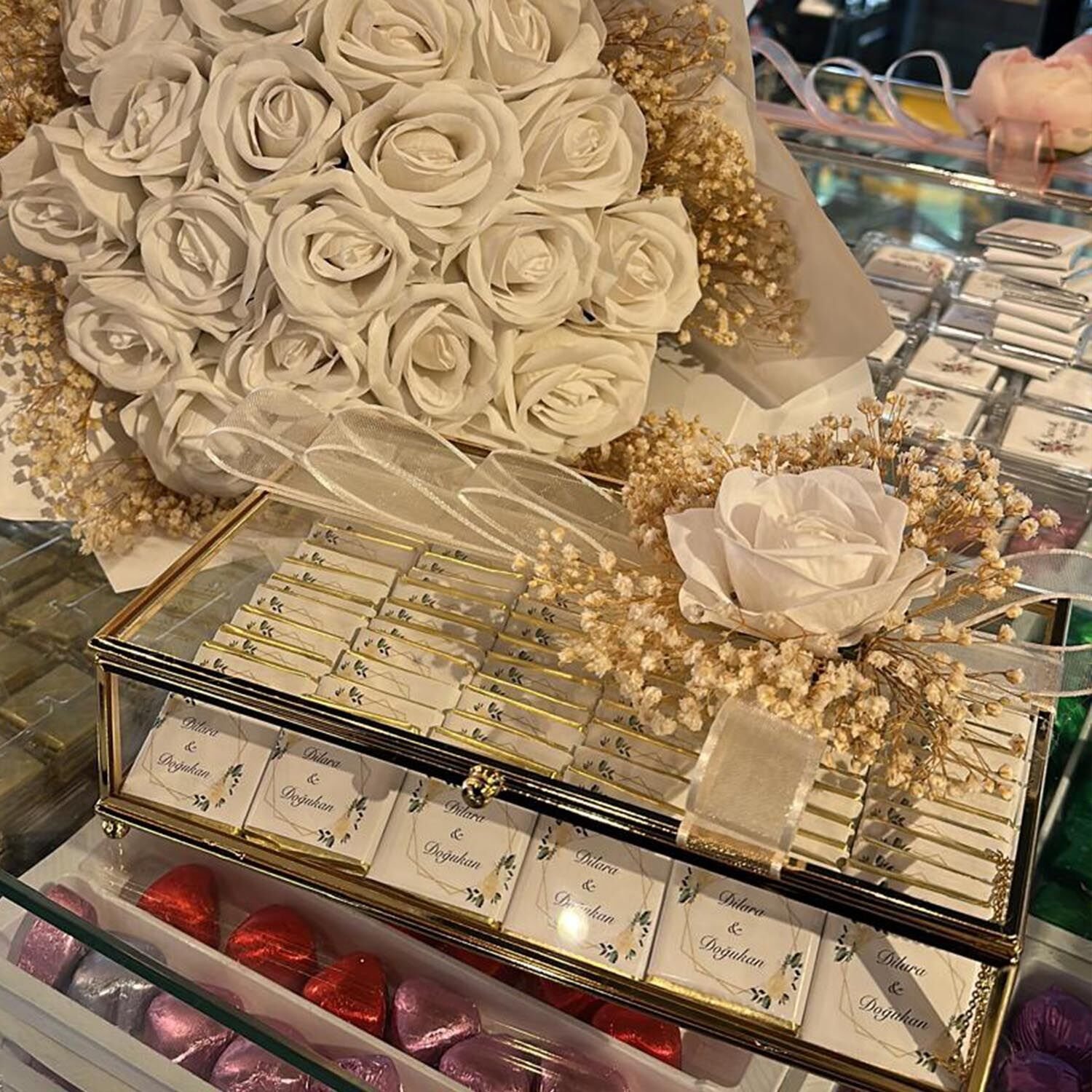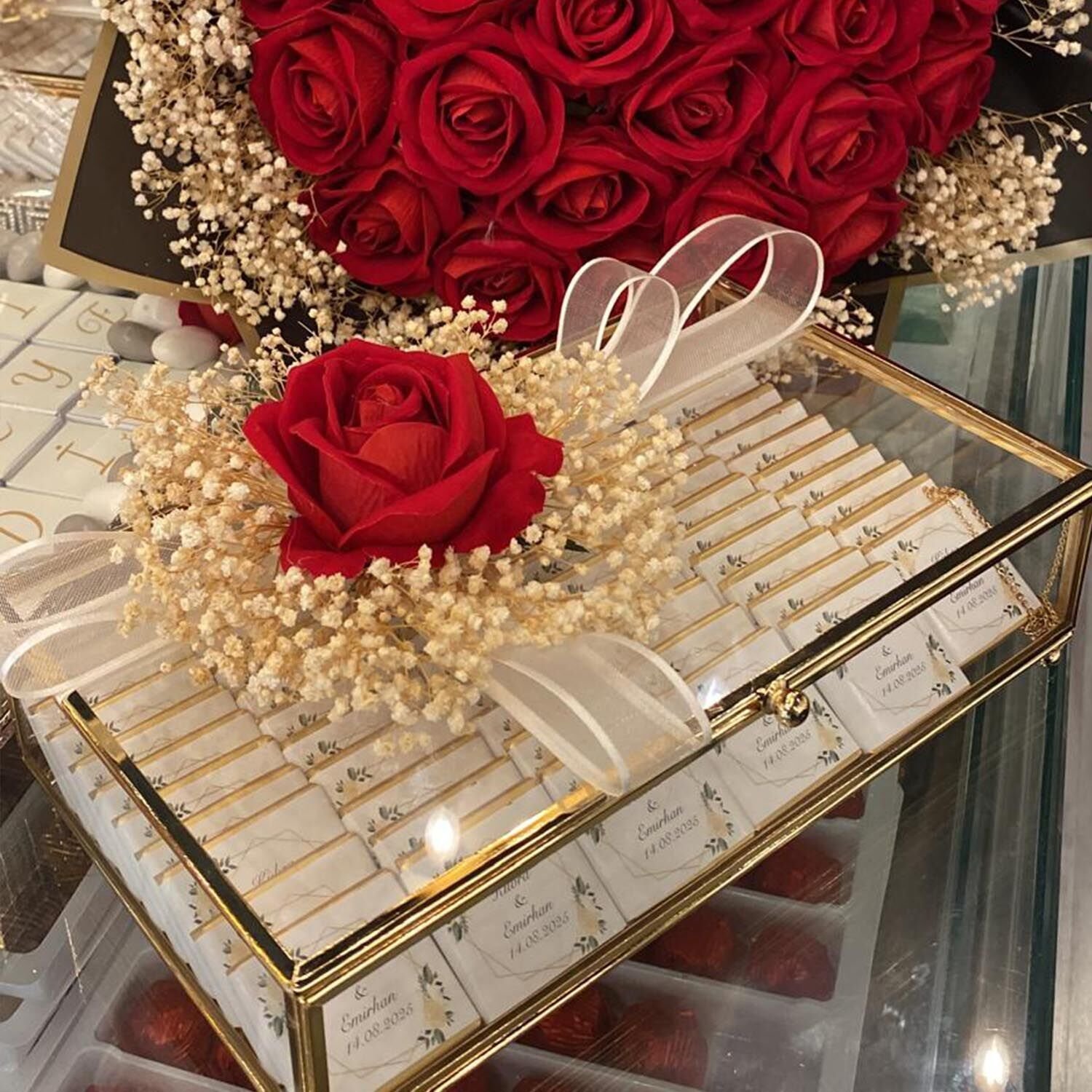 - kutu içeriği sütlü sargılı isim yazılı madlen çikolatalarla hazırlanmaktadır