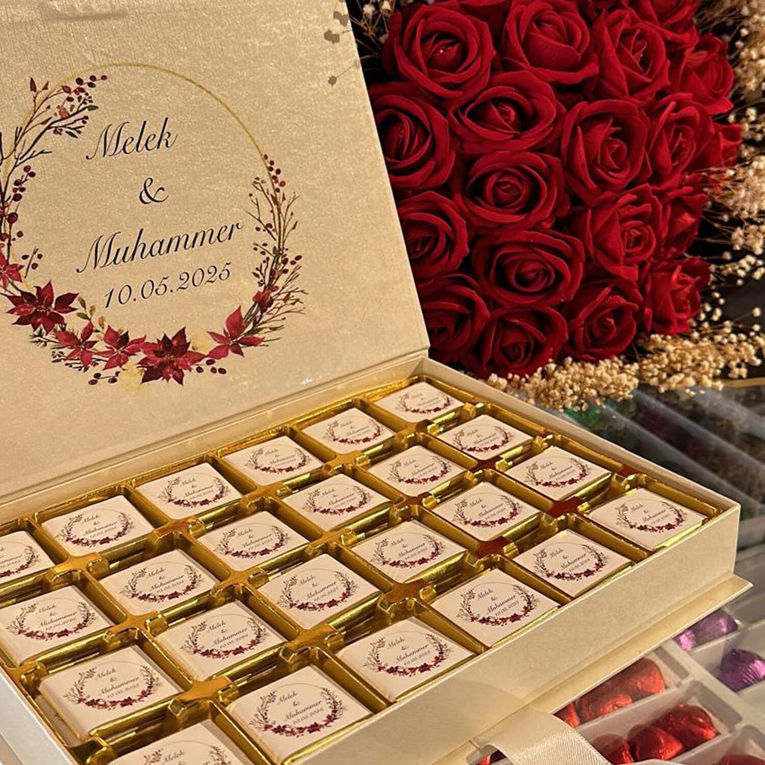 - kutu içeriği sütlü sargılı isim yazılı madden çikolatalarla hazırlanmaktadır