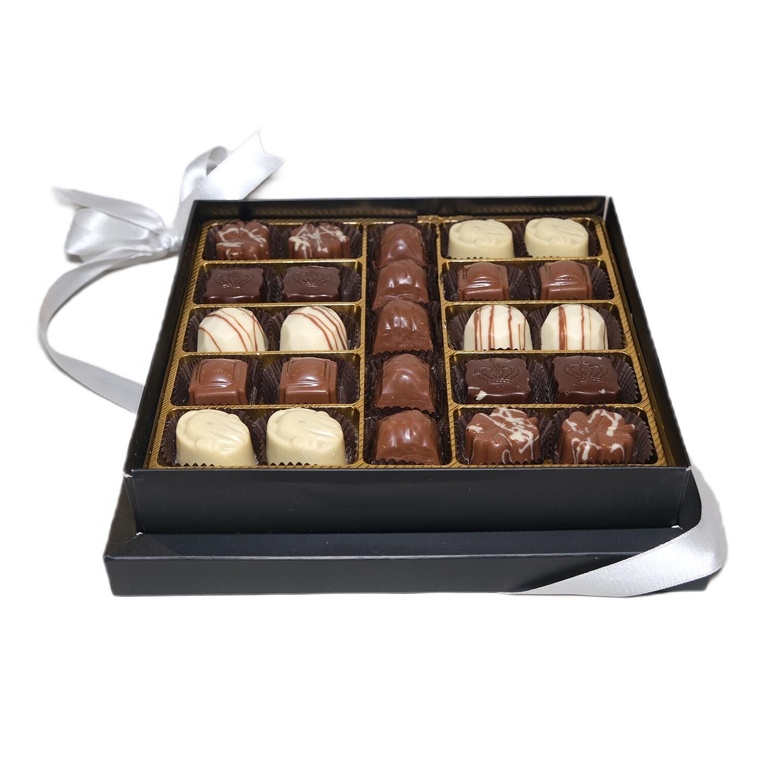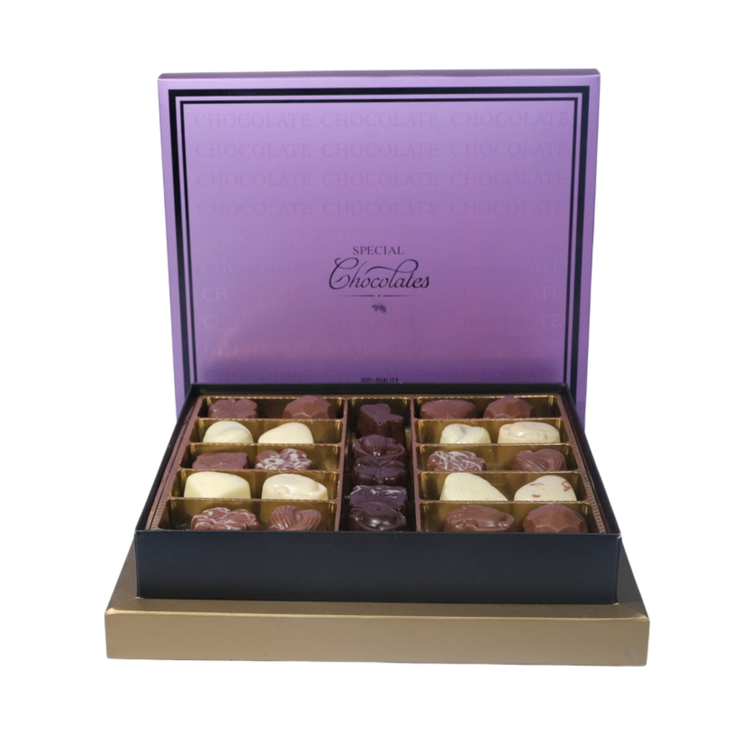 El yapımı ustalığımızla hazırladığımız bu özel kutu içerisinde 26 adet (365 gr) çikolata yer almaktadır. Her biri özenle seçilmiş Belçika Callebaut ham maddesiyle üretilen çikolatalarımız; sütlü, beyaz ve bitter çeşitleriyle damağınızda unutulmaz bir tat bırakır.